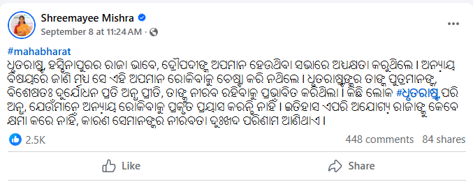 ଟିକେ ଭଲ କରି ଦେଖନ୍ତୁ ଫେସବୁକରେ ଶ୍ରୀମୟୀ ମିଶ୍ର ଲେଖିଥିବା ଏ ଲେଖାକୁ । ମହାଭାରତର କରୁସଭା କଥା ଲେଖି ବିଜେଡିକୁ ସିଧାସିଧା ଟାର୍ଗେଟ୍ କରିଛନ୍ତି ଶ୍ରୀମୟୀ । ଚର୍ଚ୍ଚା ହେଉଛି ଶ୍ରୀମୟୀ ନବୀନଙ୍କୁ ନେତ୍ରହୀନ ଓ ପୁତ୍ର ପ୍ରେମୀ ଧୃତରାଷ୍ଟ୍ର କହିବା ସହ ପାଣ୍ଡିଆନଙ୍କୁ ଦୁର୍ଯ୍ୟେଧନ ବୋଲି ଦର୍ଶାଇଛନ୍ତି । ତେବେ ୨୦୨୪ ସାଧାରଣ ନିର୍ବାଚନ ବେଳେ ଭୁବନେଶ୍ବର ସାଂସଦ ପ୍ରାର୍ଥୀ ଭାବରେ ଶ୍ରୀମୟୀଙ୍କୁ ପ୍ରୋଜେକ୍ଟ କରିଥିଲା ବିଜେଡ଼ି । କିନ୍ତୁ ଶେଷ ମୁହୁର୍ତ୍ତରେ ଘୋଷଣା ହୋଇଥିଲା ମନ୍ମଥ ରାଉତରାୟଙ୍କ ନାଁ ।